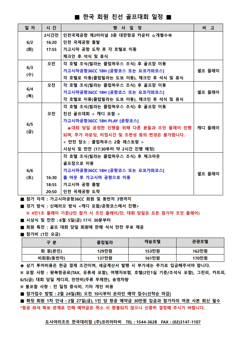 - 기리시마관광 : 회원 162만원, 동반자 170만원